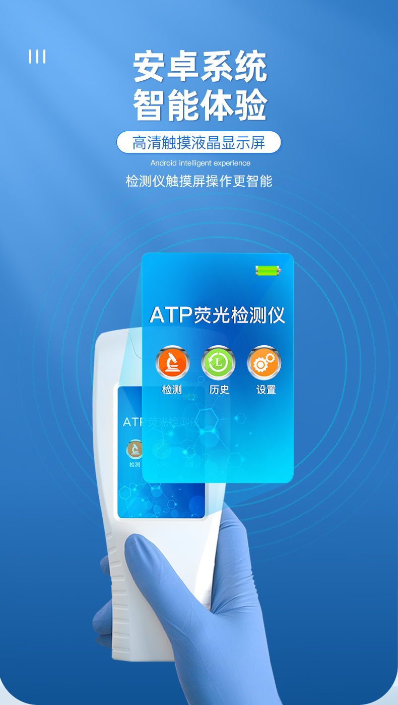 該設(shè)備為全新升級產(chǎn)品,大屏幕觸摸顯示屏,代替?zhèn)鹘y(tǒng)按鍵。操作采用生物化學(xué)反應(yīng)方法檢測ATP含量,ATP熒光檢測儀基于螢火蟲發(fā)光原理,利用“熒光素酶—熒光素體系”快速檢測三磷酸腺苷(ATP)。ATP拭子含有可以裂解細(xì)胞膜的試劑,能將細(xì)胞內(nèi)ATP釋放出來,與試劑中含有的特異性酶發(fā)生反應(yīng),產(chǎn)生光,再用熒光照度計(jì)檢測發(fā)光值,微生物的數(shù)量與發(fā)光值成正比,由于所有生物活細(xì)胞中含有恒量的ATP,所以ATP含量可以清晰地表明樣品中微生物與其他生物殘余的多少,用于判斷衛(wèi)生狀況。