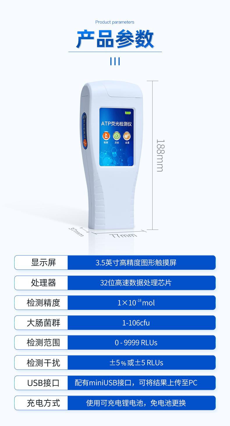 該設(shè)備為全新升級(jí)產(chǎn)品,大屏幕觸摸顯示屏,代替?zhèn)鹘y(tǒng)按鍵。操作采用生物化學(xué)反應(yīng)方法檢測(cè)ATP含量,ATP熒光檢測(cè)儀基于螢火蟲(chóng)發(fā)光原理,利用“熒光素酶—熒光素體系”快速檢測(cè)三磷酸腺苷(ATP)。ATP拭子含有可以裂解細(xì)胞膜的試劑,能將細(xì)胞內(nèi)ATP釋放出來(lái),與試劑中含有的特異性酶發(fā)生反應(yīng),產(chǎn)生光,再用熒光照度計(jì)檢測(cè)發(fā)光值,微生物的數(shù)量與發(fā)光值成正比,由于所有生物活細(xì)胞中含有恒量的ATP,所以ATP含量可以清晰地表明樣品中微生物與其他生物殘余的多少,用于判斷衛(wèi)生狀況。