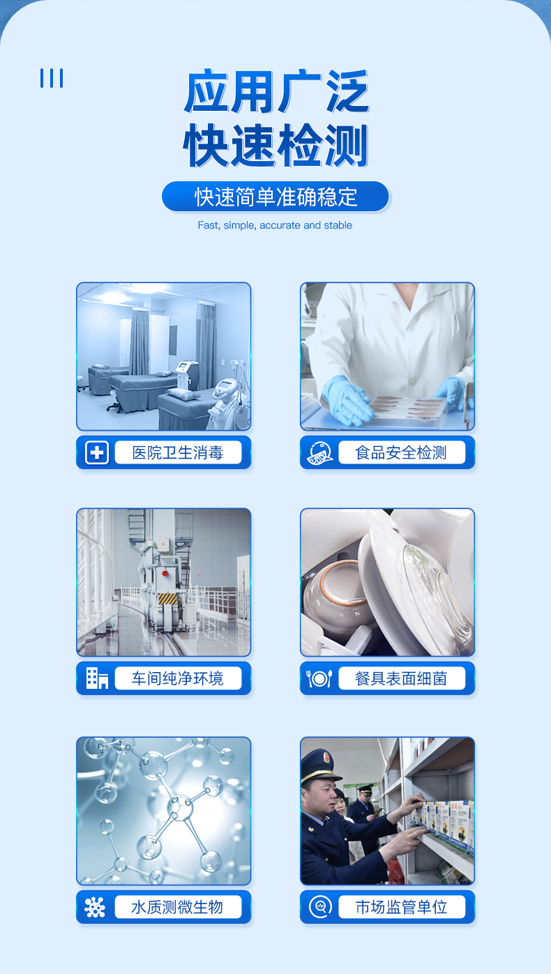 云唐ATP熒光檢測(cè)儀廣泛應(yīng)用于:細(xì)菌微生物檢測(cè)、醫(yī)藥衛(wèi)生、食品安全、市場(chǎng)執(zhí)法、表面潔凈度檢測(cè)、醫(yī)療防疫、水質(zhì)水政、生產(chǎn)線衛(wèi)生、工業(yè)水處理、環(huán)保檢測(cè)、海關(guān)出入境檢疫及其他執(zhí)法部門(mén)等多種行業(yè)。