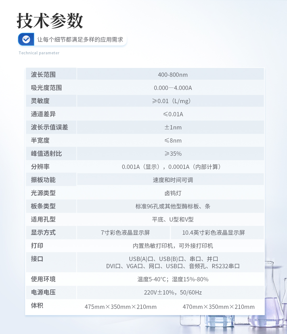 波長范圍: 400-800nm | *濾光片配置:10個濾光片位置,標(biāo)配405nm、450nm、492nm、630nm,選配6定制波長 | 吸光度范圍:0.000―4.000A | *光通道數(shù):8通道光路檢測,另設(shè)一個獨(dú)立參比通道 | *示值穩(wěn)定性:≤±0.002A或≤0.5%T/10min。 | *示值誤差(準(zhǔn)確性):≤±0.005A或±0.2%T | *重復(fù)性:≤0.2%或≤0.2%T。 | 靈敏度:≥0.01(L/mg)。 | 通道差異:≤0.01A。 | 波長示值誤差:±1nm | 半寬度:≤8nm | 峰值透射比:≥35% | 分辨率:0.001A(顯示),0.0001A(內(nèi)部計(jì)算) | *讀板速度:單波長≤3秒/96孔,雙波長≤6秒/96孔 | 振板功能:速度和時(shí)間可調(diào) | 光源類型:鹵鎢燈 | 板條類型:標(biāo)準(zhǔn)96孔或其他型酶標(biāo)板、條 | 適用孔型:平底、U型和V型 | *顯示方式:10.4英寸彩色液晶顯示屏顯示 | 輸入方式:觸摸屏輸入,可選配鼠標(biāo)和鍵盤 | 打?。簝?nèi)置熱敏打印機(jī),可外接打印機(jī) | 接 口:DVI口、VGA口、網(wǎng)口、USB口、音頻孔、RS232串口 | 使用環(huán)境:溫度5-40℃;濕度15%-80% | 電源電壓:220V±10%,50/60Hz | 體積:470mm×350mm×210mm(長×寬×高) | 重量:11.5Kg |