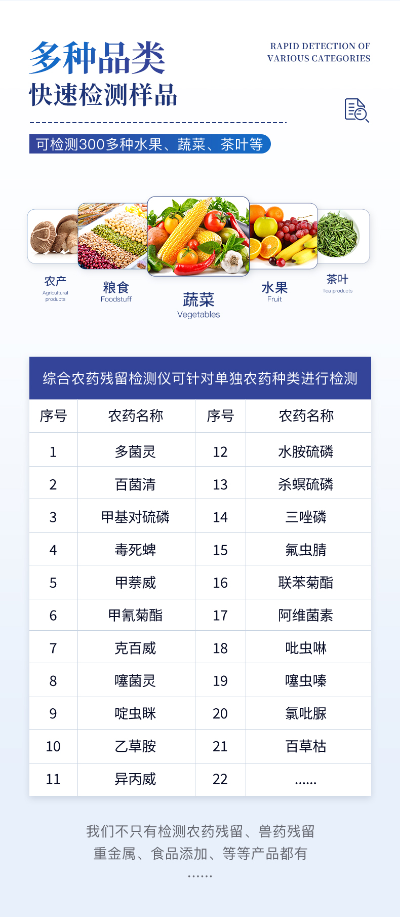 綜合農(nóng)藥殘留檢測(cè)儀,除了遵循國(guó)標(biāo)對(duì)有機(jī)磷和氨基甲酸酯類(lèi)農(nóng)藥進(jìn)行檢測(cè)外,還可以針對(duì)具體農(nóng)藥進(jìn)行分項(xiàng)準(zhǔn)確檢測(cè),包含阿維菌素,啶蟲(chóng)脒,噻蟲(chóng)胺,噻蟲(chóng)嗪,毒死蜱,氟蟲(chóng)氰,氧樂(lè)果,克百威,甲拌磷、甲基吡啶磷、阿滅丁、雙甲脒、等眾多殺蟲(chóng)劑化合物。