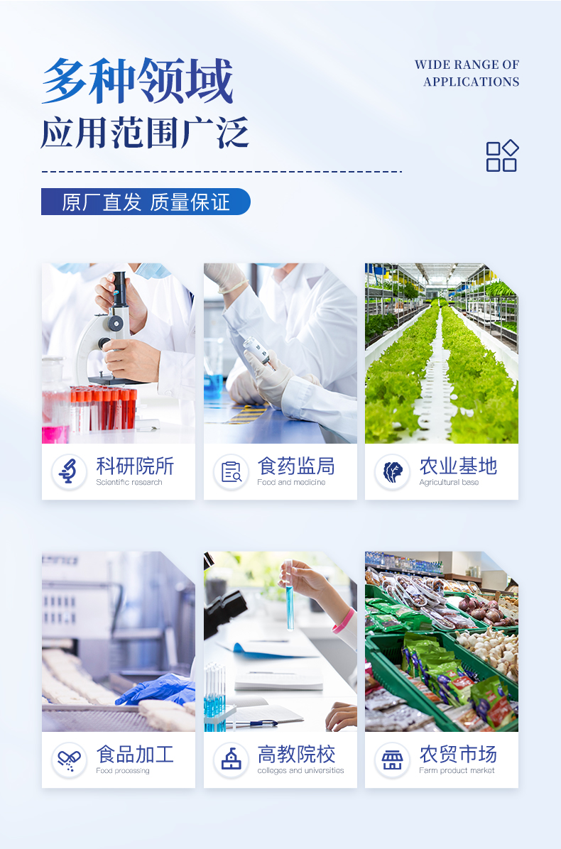 廣泛應用于主要用于蔬菜、水果、茶葉、糧食、農(nóng)副產(chǎn)品等食品中有機磷和氨基甲酸酯類農(nóng)藥殘留的快速檢測;此外還可用于果蔬茶生產(chǎn)基地和農(nóng)貿(mào)批發(fā)銷售市場現(xiàn)場檢測,餐館、學校、食堂、家庭果蔬加工前的安全速測等。