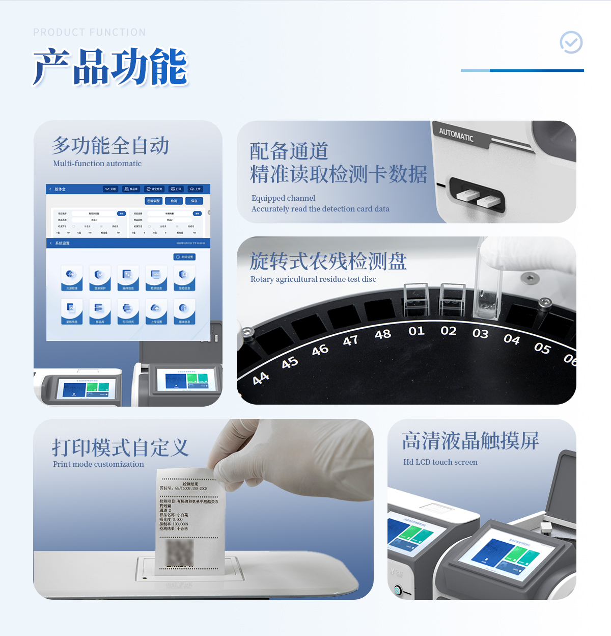 1. 試劑位置:3個 | 2. 農(nóng)殘檢測盤:旋轉(zhuǎn)48通道比色盤,可任意選擇檢測通道,自動對應選擇通道。 | 3. 膠體金通道:6個單通道,1個三聯(lián)卡通道,可讀取檢測卡結(jié)果,自動采集、處理分析,自動判斷檢測結(jié)果,并具備自動判空功能。 | 4.系統(tǒng)配置:10.1寸高清液晶觸摸屏,采用ARM Cortex-A7,RK3288/4核處理器,運行內(nèi)存1GB。Android7.1.1 系統(tǒng)分辨率1280×800。 | 5.恒溫系統(tǒng):具有自動加溫溫控系統(tǒng),精準恒溫37℃,精度±0.1℃。 | 6.添加系統(tǒng):儀器按照試劑要求自動、按時、按量加入試劑,并且自動對未正常放置的樣本或異常的樣本進行檢查并提示。 | 7.清洗功能:儀器具備回流及自動清洗管路功能,避免試劑污染。 | 8.混勻功能:設備具備自動混勻功能。 | 9.光源校準:設備可自動校準,確保檢測準確度。 | 10.實時監(jiān)控:儀器測試過程中屏幕顯示運行狀態(tài),可實時查看。 | 11.數(shù)據(jù)存儲:內(nèi)部存儲16GB,可存儲500萬條數(shù)據(jù)。 | 12.樣品多選功能:設備具備樣品一鍵多選功能,選擇樣品自動匹配檢測通道。 | 13.項目預設:可提前設置單個及多個相同或不相同的檢測任務,可單次或者多次調(diào)取,減少檢測時間。 | 14.自定義打印系統(tǒng):內(nèi)置自定義打印系統(tǒng),可按需靈活設置開啟或關閉:產(chǎn)品合格證(國家農(nóng)業(yè)部標準),二維碼,抽樣信息、檢測信息,受檢信息等信息的打印。 | 15.A4版本報告打印功能:設備可自動生成A4版報告,A4報告帶二維碼,可掃描二維碼生成電子版,并可識別真?zhèn)巍?/td> | 16.傳輸方式:儀器配備無線通信模塊: 4G(APN)通訊模塊、Wifi模塊,藍牙傳輸模塊,同時具有USB接口以及RJ45接口能以多種方式實現(xiàn)數(shù)據(jù)保存和數(shù)據(jù)傳輸功能,設備數(shù)據(jù)可以同步上傳至平臺。 | 17.數(shù)據(jù)監(jiān)管系統(tǒng):設備自帶監(jiān)管平臺,并可同步對接監(jiān)管平臺,數(shù)據(jù)可局域網(wǎng)和互聯(lián)網(wǎng)數(shù)據(jù)上傳,檢測結(jié)果可直接傳至食品安全監(jiān)管平臺。達到食品安全問題預估、預警。 | 18.系統(tǒng)遠程更新功能:無需設備返廠,即可遠程實時升級全新系統(tǒng),節(jié)省時間成本及避免運輸造成設備損。 |