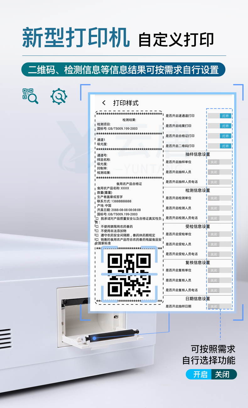 9.7.1、全新打印系統(tǒng):內(nèi)置全新打印機,新創(chuàng)自定義打印方式,可按需靈活勾選控制:產(chǎn)品合格證(國家農(nóng)業(yè)部標準要求),二維碼,抽樣信息、檢測信息,受檢信息、復核信息、抽樣日期、檢測日期等信息的打印。