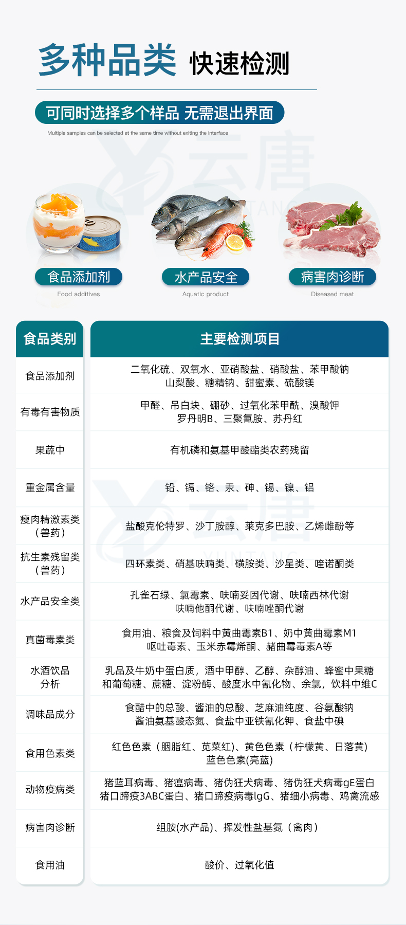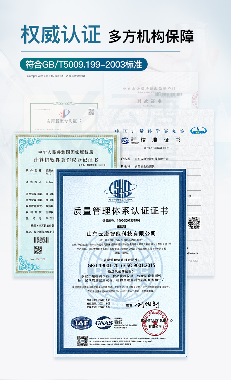 山東云唐智能科技有限公司生產(chǎn)的高智能食品安全檢測儀為集成化食品安全快速檢測分析設(shè)備,采用臺式一體化設(shè)計,可快速檢測200多種食品安全項目,包含非食用化學物質(zhì)、濫用食品添加劑、農(nóng)藥殘留、獸藥殘留、重金屬、病害肉、營養(yǎng)強化劑、抗生素類殘留、激素類殘留、真菌毒素類殘留、化學類殘留等項目的定性定量檢測。