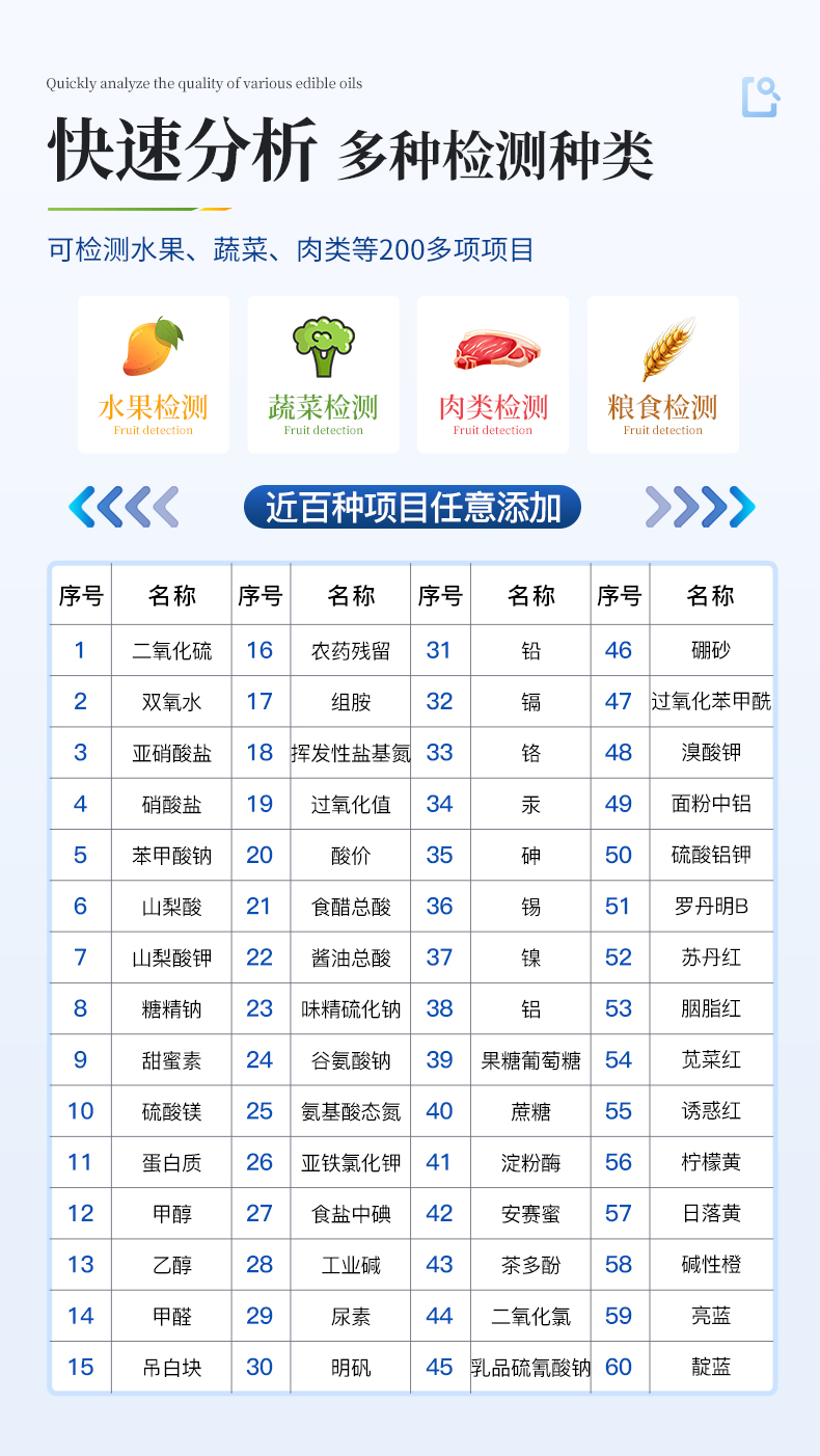 高精度食品安全檢測儀可快速檢測60多項目,包含:濫用食品添加劑、非食用化學物質(zhì)、農(nóng)藥殘留、重金屬含量、病害肉成分、營養(yǎng)強化劑、化學類殘留、食用油脂檢測、水酒飲品分析、調(diào)味品成分、食用色素等現(xiàn)場的定性定量檢測。