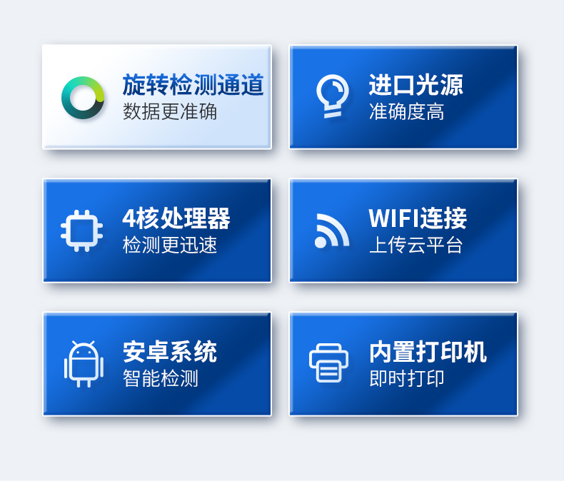 3、顯示屏幕:儀器采用7英寸液晶觸摸屏,搭配運行安卓智能操作系統(tǒng),主控芯片采用ARM Cortex-A7,RK3288/4核處理器,主頻1.88Ghz,操作方便,性能更強。