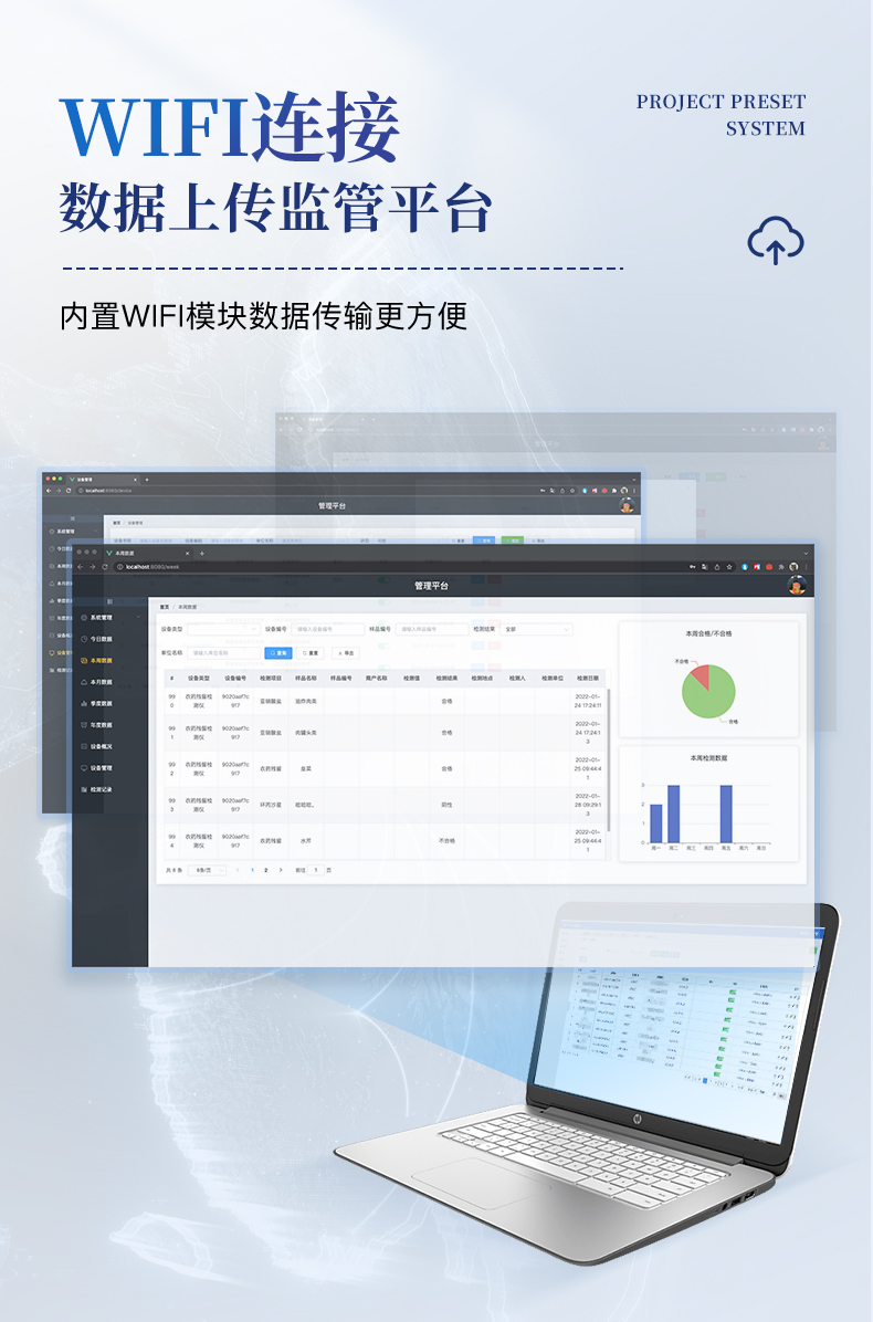 5、儀器帶有監(jiān)管平臺,數(shù)據(jù)可局域網(wǎng)和互聯(lián)網(wǎng)數(shù)據(jù)上傳,檢測結(jié)果直接傳至食品安全監(jiān)管平臺。進行區(qū)域食品安全監(jiān)管及大數(shù)據(jù)分析處理與數(shù)據(jù)統(tǒng)計,檢測區(qū)域食品安全長短期動態(tài),達到食品安全問題預估、預警