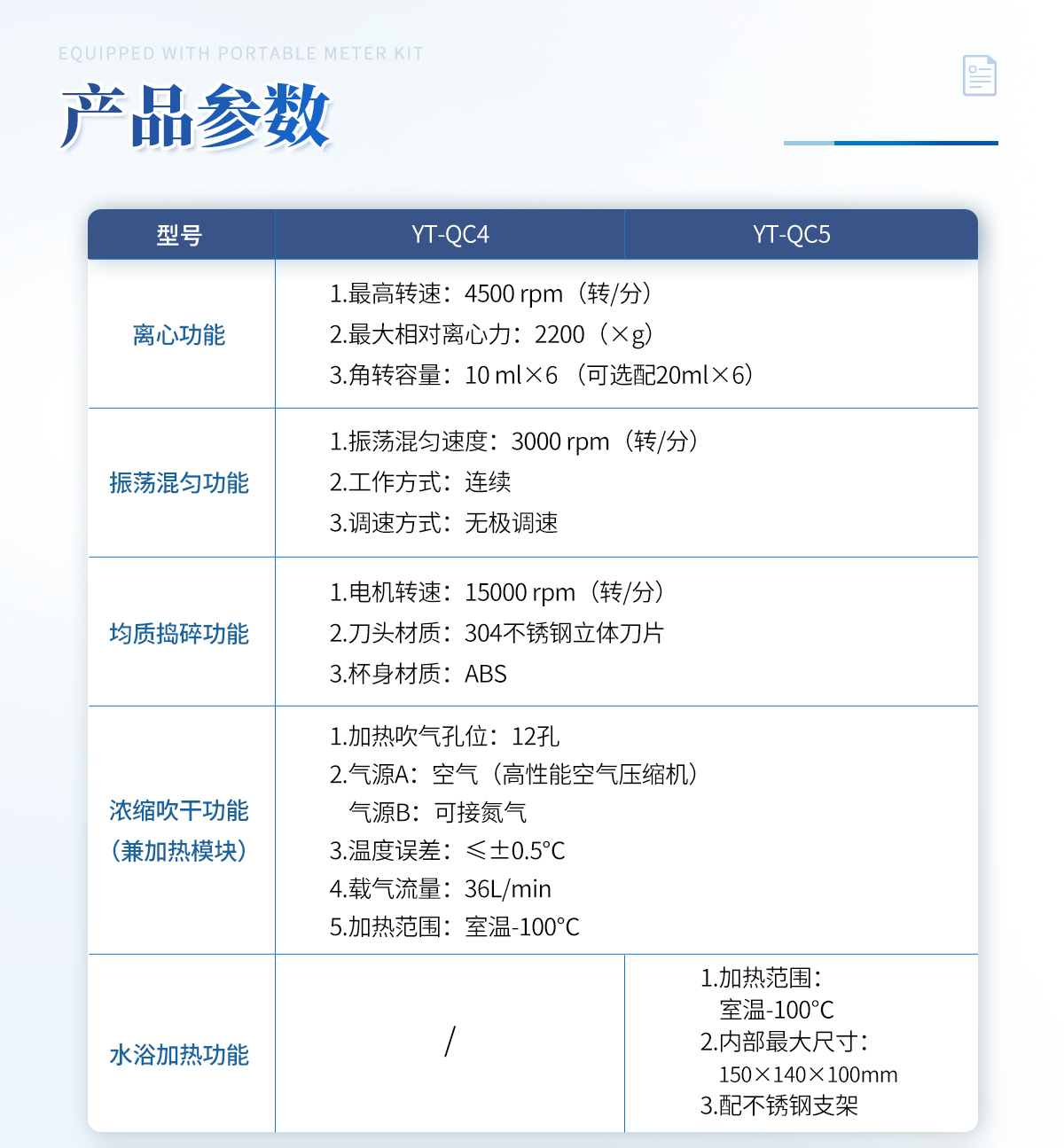 離心功能 1.**轉(zhuǎn)速:4500 rpm(轉(zhuǎn)/分) 2.**相對離心力:2200(×g) 3.角轉(zhuǎn)容量:10 mlx6 (可選配20mlx6) | 振蕩混勻功能 1.振蕩混勻速度:3000 rpm(轉(zhuǎn)/分) 2.工作方式:連續(xù) 3.調(diào)速方式:無極調(diào)速 | 均質(zhì)搗碎功能 1.電機(jī)轉(zhuǎn)速:15000 rpm(轉(zhuǎn)/分) 2.刀頭材質(zhì):304不銹鋼立體刀片 3.杯身材質(zhì):ABS | 濃縮吹干功能(兼加熱模塊) 1.加熱吹氣孔位: 12孔 2.氣源A: 空氣(高性能空氣壓縮機(jī)) 氣源B: 可接氮?dú)? 3.溫度誤差:≤±0.5℃ 4.載氣流量:36L/min 5.加熱范圍:室溫-100℃ | 水浴加熱 1.加熱范圍:室溫-100℃ 2.內(nèi)部**尺寸:150mmX140mmX100mm 3.配不銹鋼支架 |