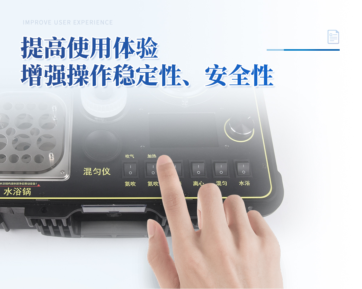 1、功能緊湊,集成五種樣品前處理常用的功能,完成樣品一站式處理。 | 2、結(jié)構(gòu)穩(wěn)固,機(jī)箱采用***工程塑料,具備**的抗沖擊性、耐腐蝕性、便攜性。 | 3、操作穩(wěn)定,機(jī)器采用五寸全彩色液晶屏,功能指示性強(qiáng),用戶操作均為實(shí)體開關(guān),杜絕佩戴手套和液體噴濺時(shí)的操作失效。 |